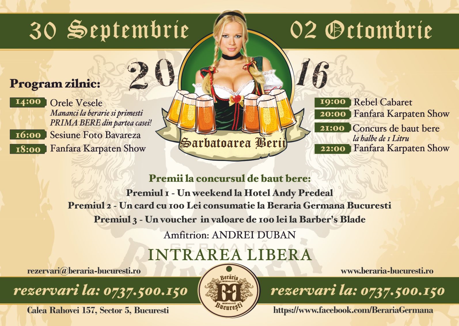 Te asteptam la berarie, in perioada 30 Septembrie – 02 Octombrie, sa petreci 3 zile si 3 nopti intr-o atmosfera bavareza autentica, cu Fanfara Karpaten Show, dansuri variate, concursuri cu premii, preparate nemtesti delicioase si nelipsita bere pe care o celebram!
