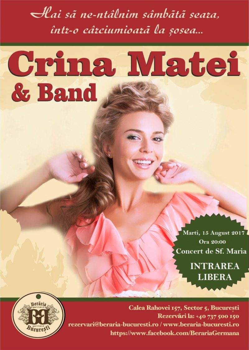 Crina este deja la al 4-lea concert la #berarie, deoarece cu prezenta ei energica, talentul artistic si repertoriul dinamic, reuseste de fiecare data sa transforme seara intr-o petrecere memorabila in care toata lumea se distreaza.